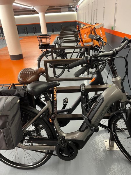 De fiets had op het achterste spatbord een kleine refelctie sticker van de Hema. Er zaten dubbele fietstassen op de achterkant van het merk New Looxs en het had een speciaal zadel.
