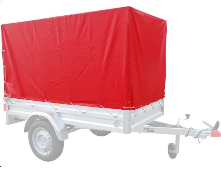 Verzinkte metalen bak met klep (achterzijde) en houten vloer. Rode huif met daaronder loofrek. Zwart stootrubber op disselkop. Klein logo duitse bouwmarktketen op achterzijde huif