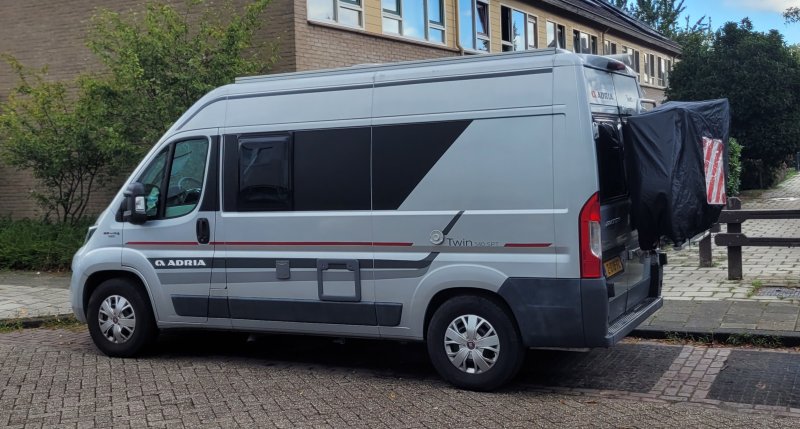 Er staan (stonden) 2 racefietsen achterop onder zwarte fietshoes met markeringsbord. Rechtsvoor op ruit groene milieusticker met 4 erop, achter bij nummerplaat een ANWB sticker + een ronde witte sticker met blauwe rand. Dakrails had ik verwijderd. Over lengte bus rode bies aan weerszijden.