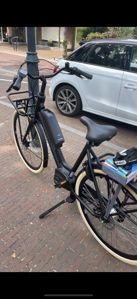 Zwart frame, beige banden, achterlicht kapot en reflector trapper hangt er half uit