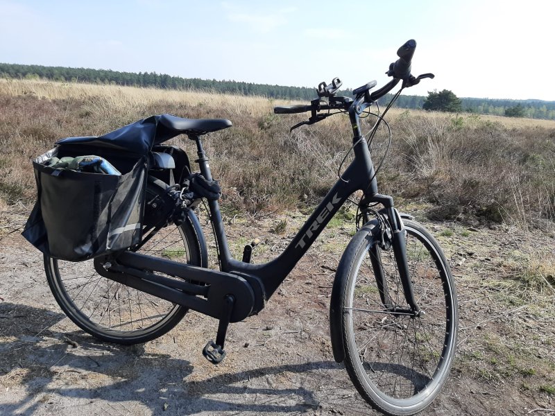 E/Bike mat zwarte damesfiets, merk Trek, Bosch accu onder bagagedrager. Grote zwarte fietstassen. Axa hangslot