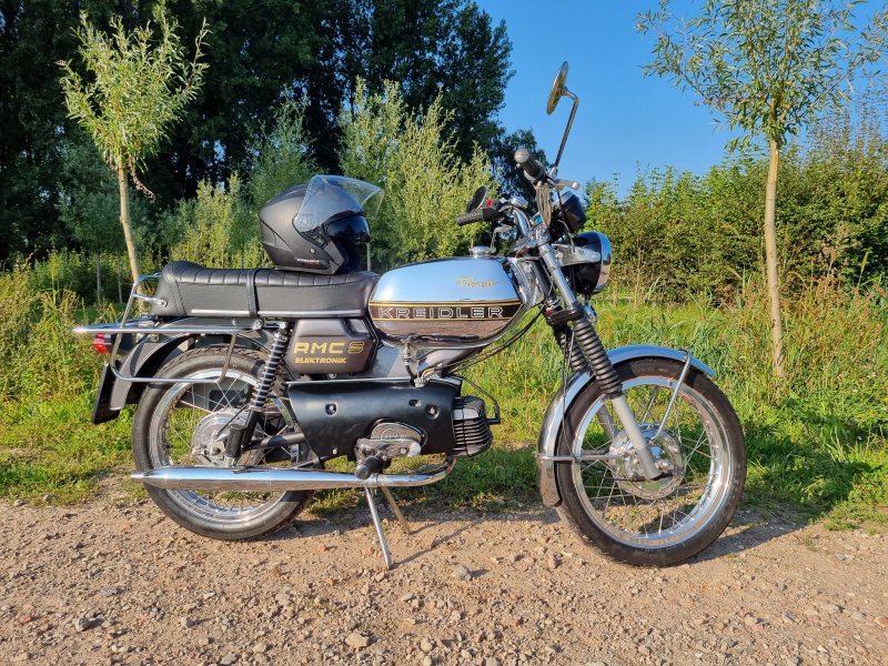 Brommer met klapkickstarter, 4 bak direct geschakeld, antraciet metallic met goudkleurige bestickering. Spaakwielen met 160mm naven.