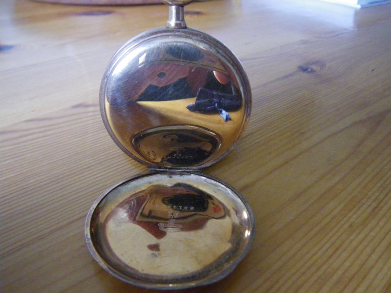 horloge was van opa met foto van oma aan de binnenkant . twee openslaande deksels voor en achterzijde ,zowel voor als achterzijde aan de buiten kant met versieringen gegraveerd